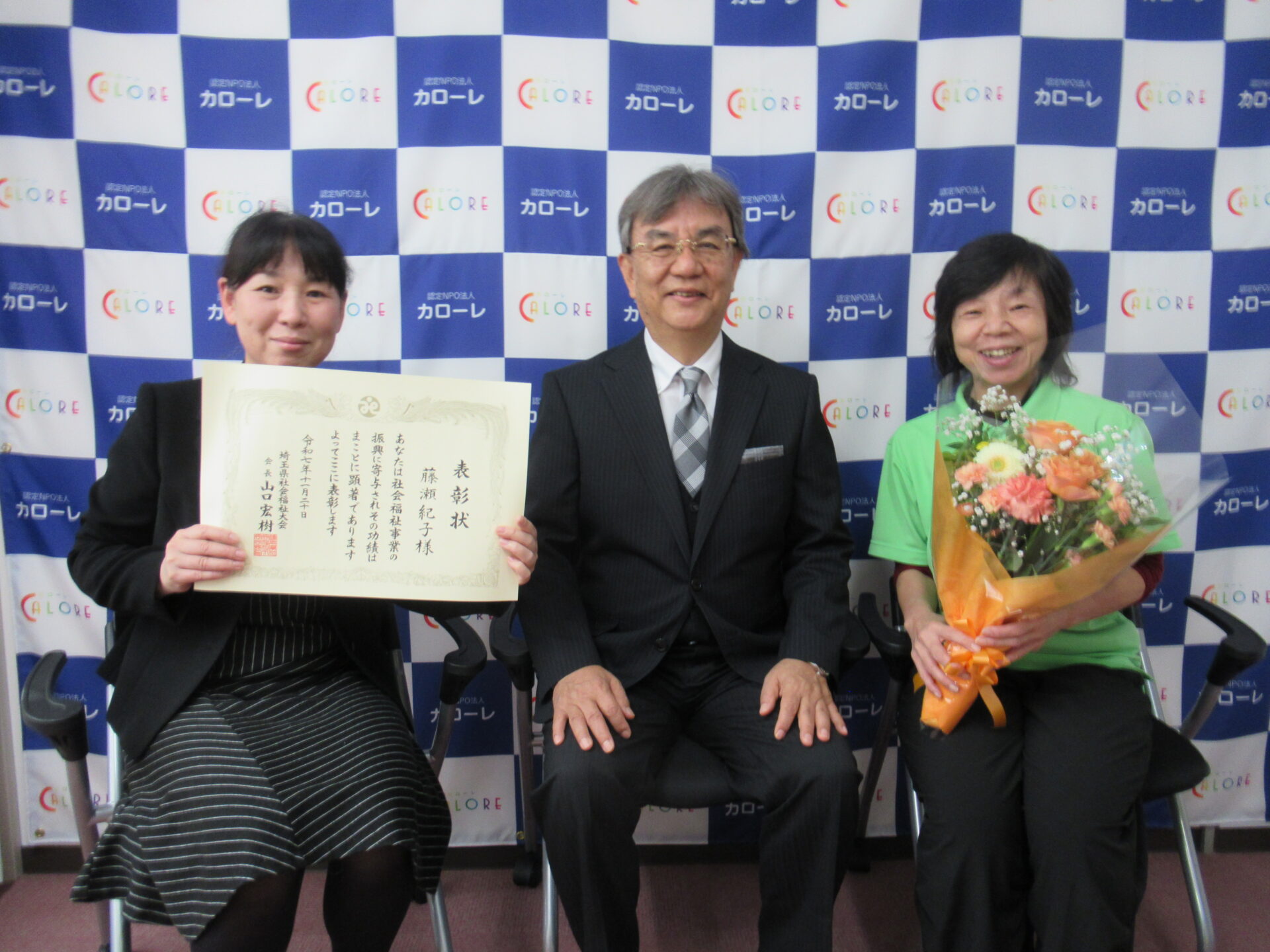 11月26日理事長から勤続15年を迎えた藤瀬紀子さんと辻美津子さんに埼玉県福祉大会会長表彰の賞状と花束が手渡されました。理事長から15年の永年勤続を祝うとともに、今後も引き続き当法人で定年を過ぎても活躍していただきたいとの言葉がありました。写真は左から藤瀬紀子さん、浅見要理事長、辻美津子さん。