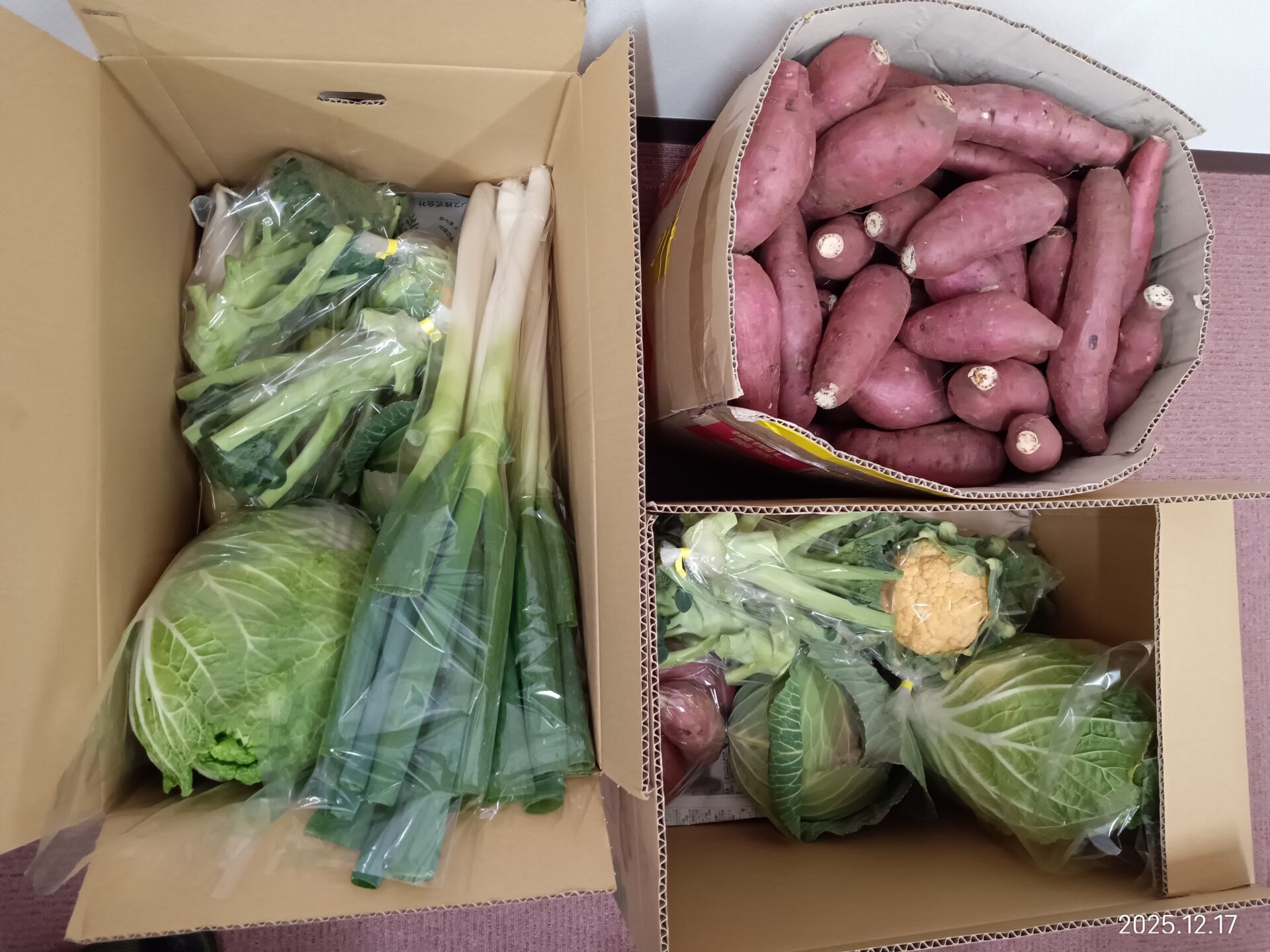12月17日、つるがしま観光農園協会の沼倉裕之様、内野慎伍様、南埜弘高様、比留間正道様、村田耕一様からさつまいも、白菜などの野菜をいただきました。ご支援ありがとうございます。