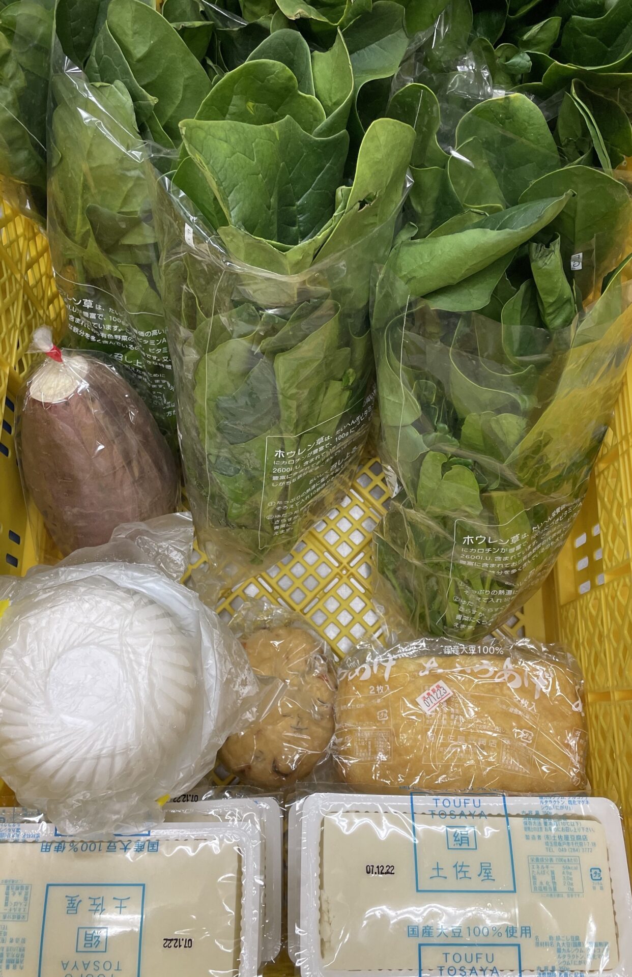 12月18日に、ほうれん草やさつまいも、豆腐、あぶらあげ、がんもどきを頂きました。