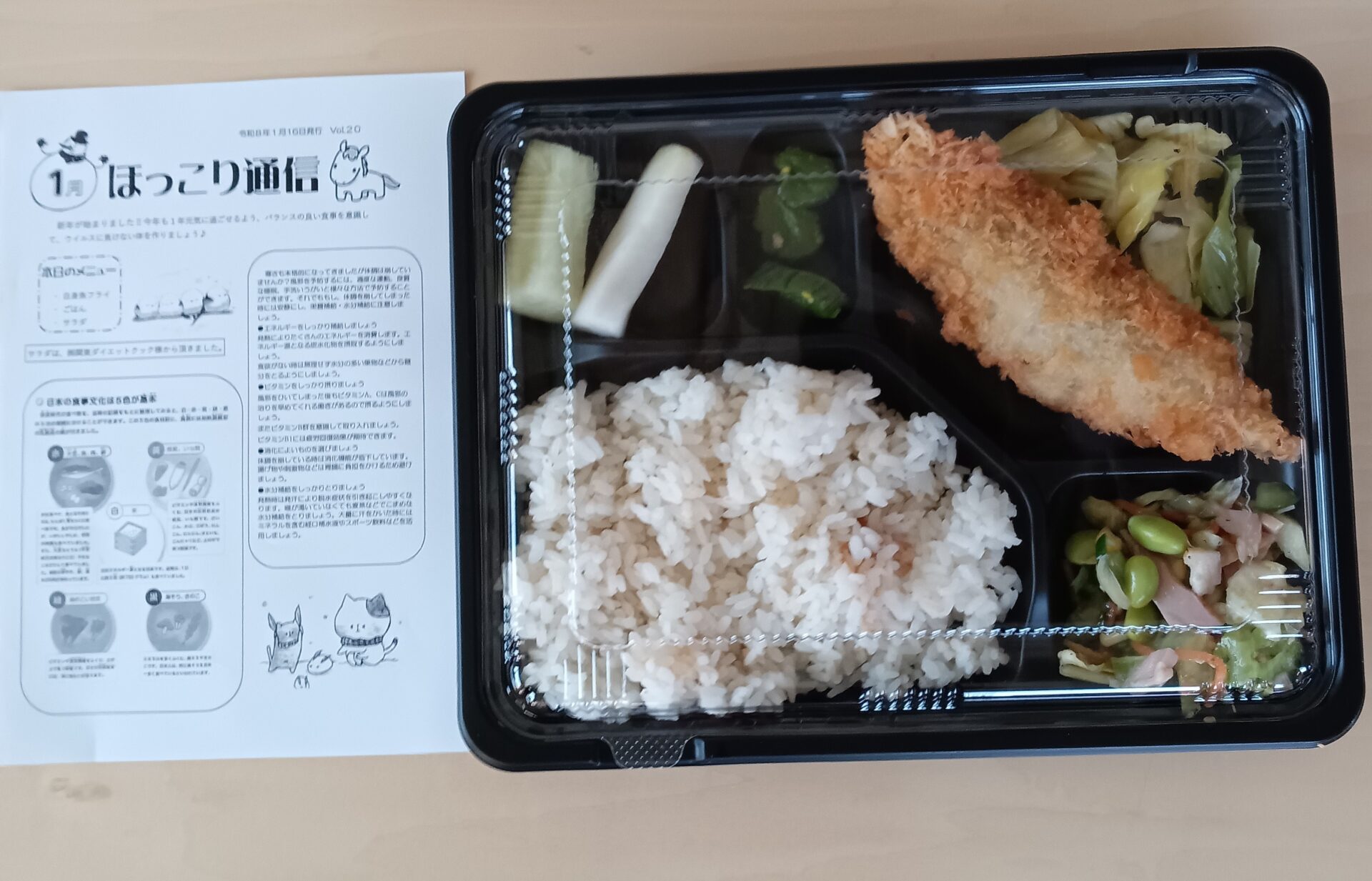 2026.02.05 test 【弁当配付】1月 ほっこり弁当便で215食配付しました 1月16日(金)に弁当支援「ほっこり弁当便」を実施しました。 今回は白身魚フライ弁当でした。 いっしょに企業様から寄附として頂いたパスタやジュース、文房具などを配付しました。 ありがとうございました。