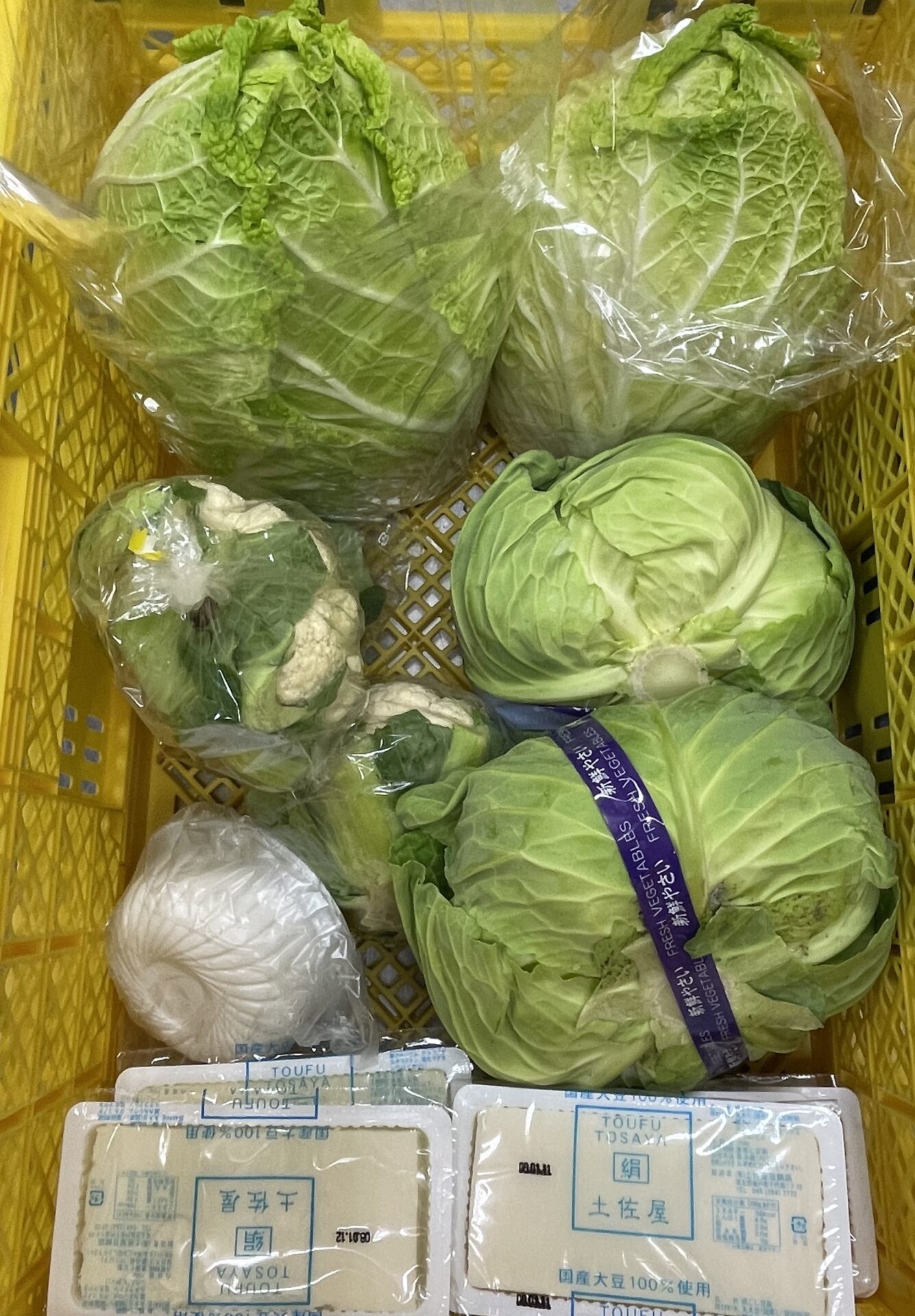 1月8日に白菜やキャベツ、カリフラワー、豆腐を頂きました。